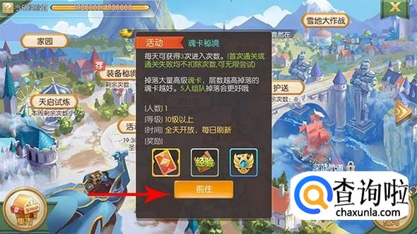 进入创造与魔法王国界面,在王国中我们点击“魂卡秘境”,查看活动界面,点击“前往”
