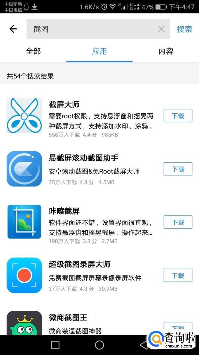 可以下载截图软件帮助截图,但部分软件需要开通root权限才能截图。