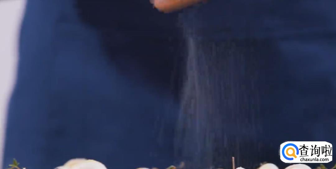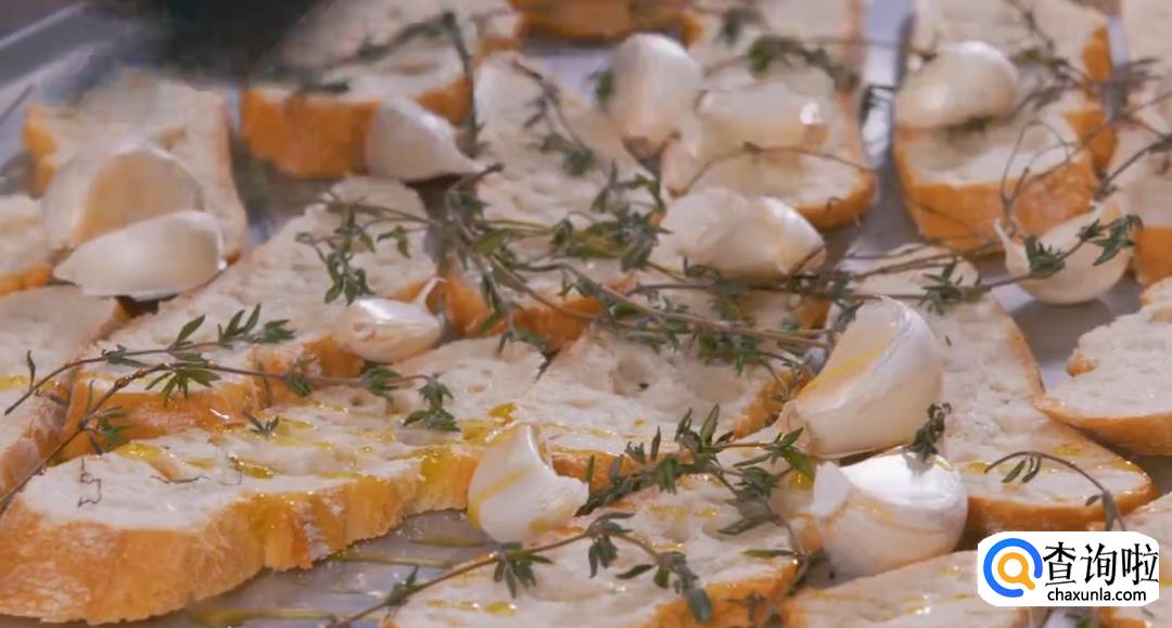 将法棍和百里香上面加上带皮的大蒜,淋上橄榄油,然后撒盐,放入烤箱中,烤到法棍变色即可拿出。