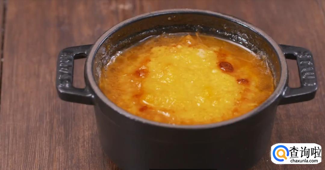 6、盛洋葱汤的是铸铁容器,这样进入烤箱后受热比较均匀。