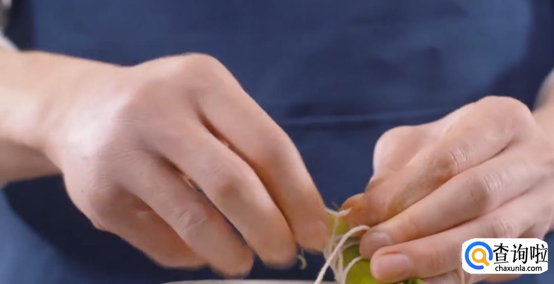 将白洋葱切丝,将百里香,月桂叶和大葱葱绿捆绑成香料节。