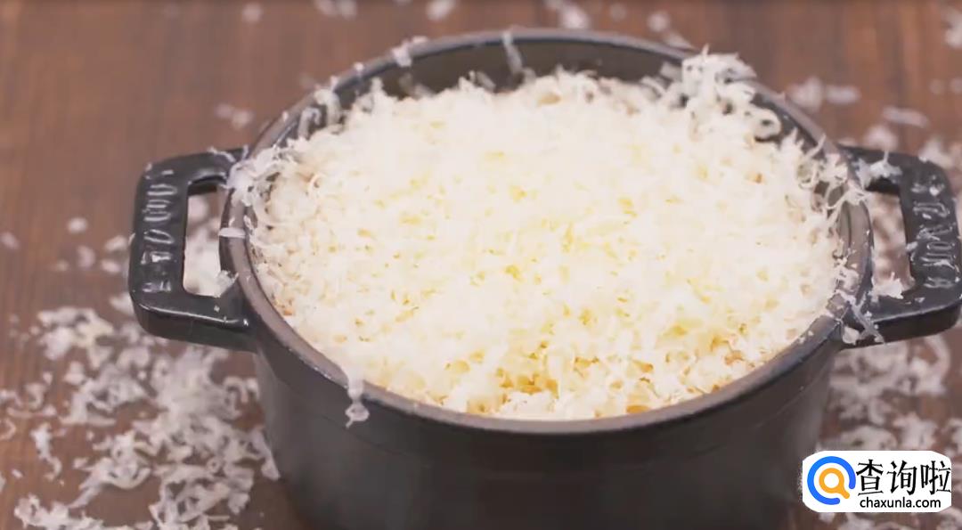 将芝士刮擦成碎末盖在容器上,放入烤箱。