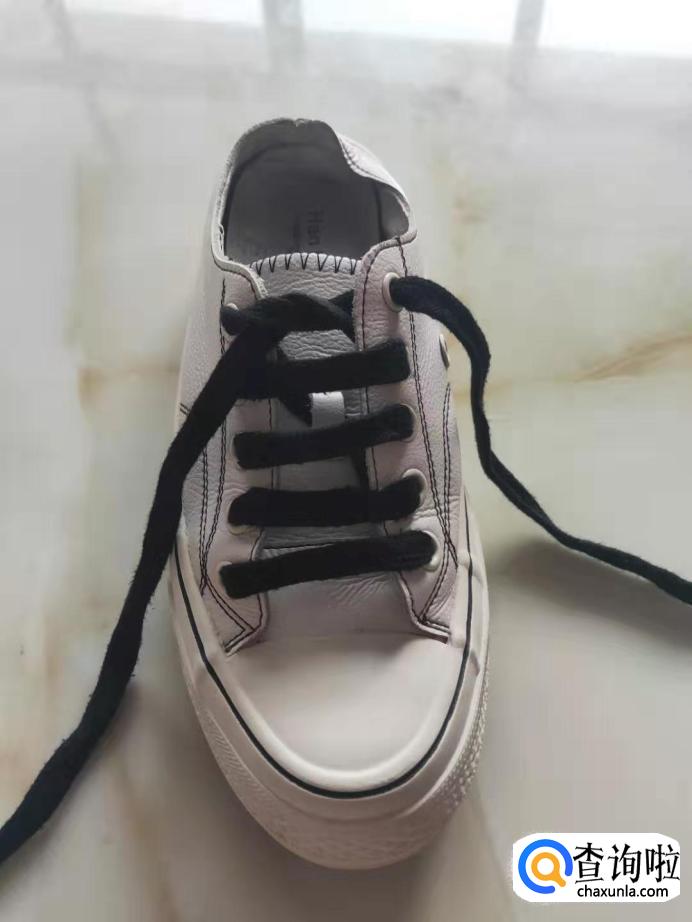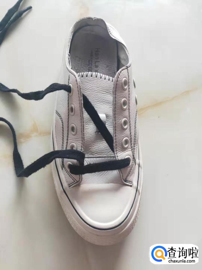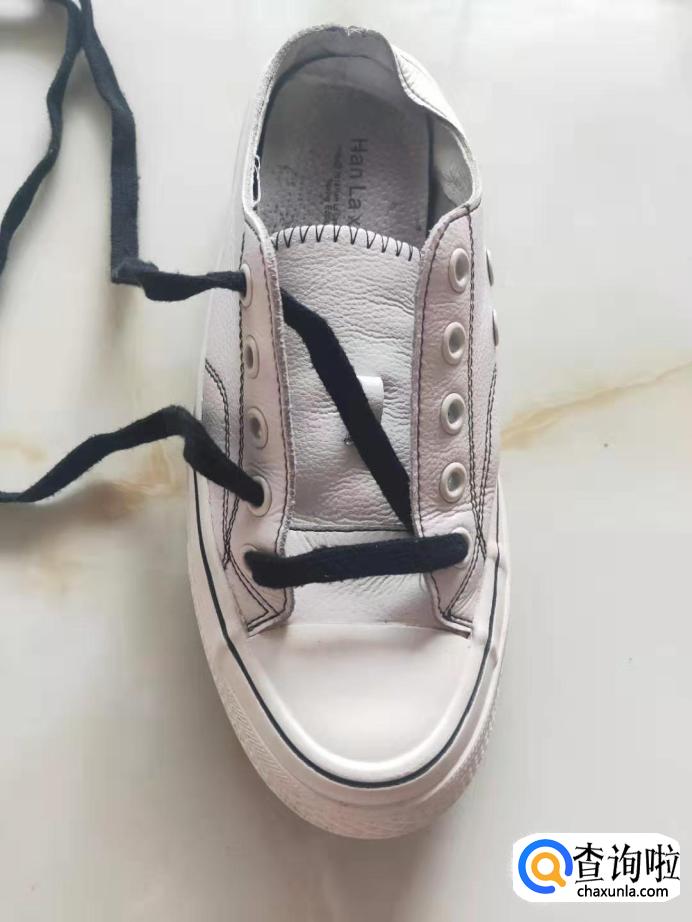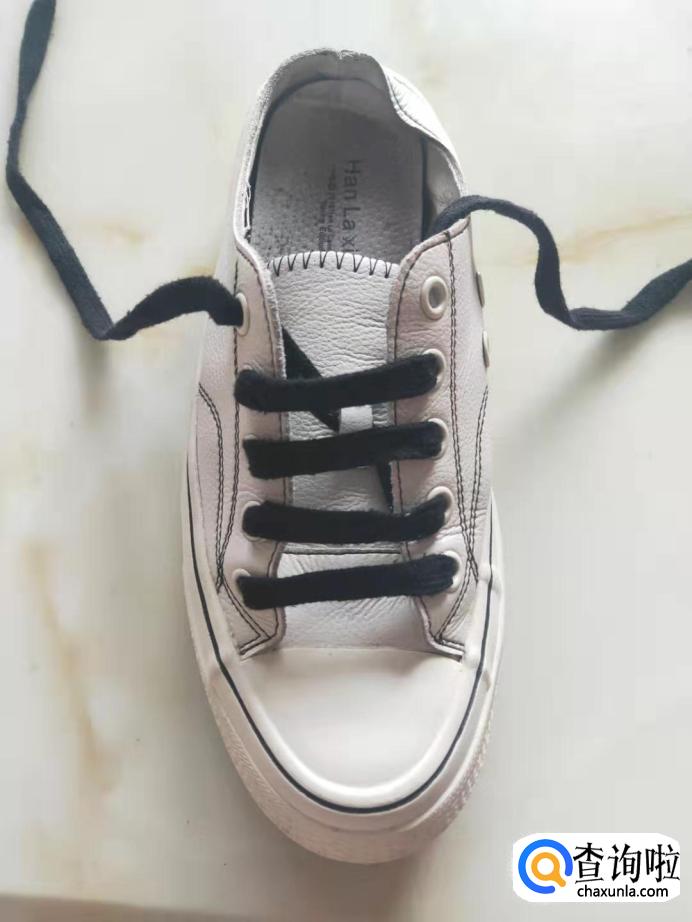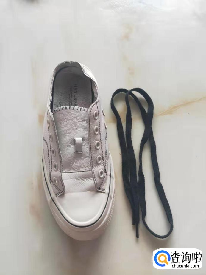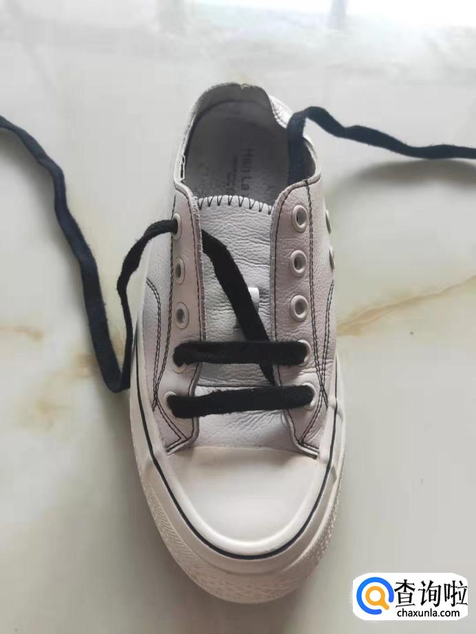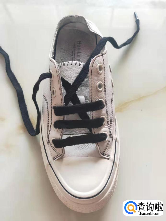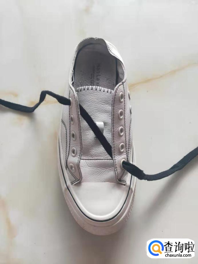 把鞋带从鞋子的左边的第一个孔穿进,拉出在传出右边的最后一个孔。