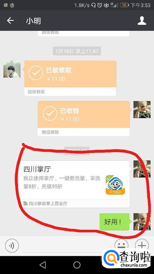 最后我们进入好友的界面后就能够看到我们所分享的四川移动掌上营业厅APP了,如图所示。