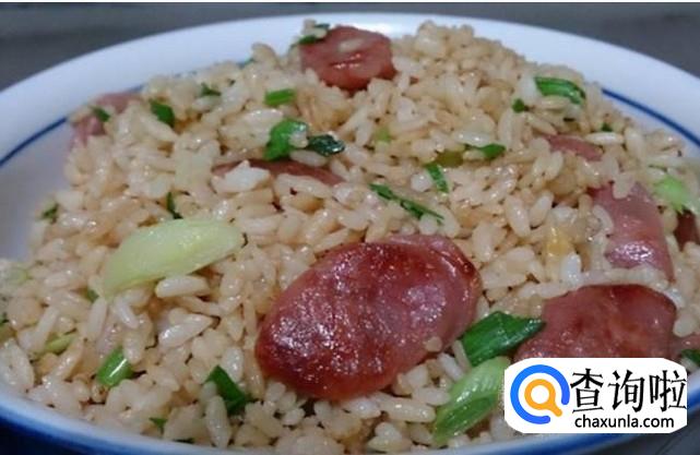 香肠炒饭,将香肠切成小块,鸡蛋打散,锅中加入油加热,倒入蛋液和米饭,最后加入香肠,起锅撒上葱花即可,方便快捷,美味营养。