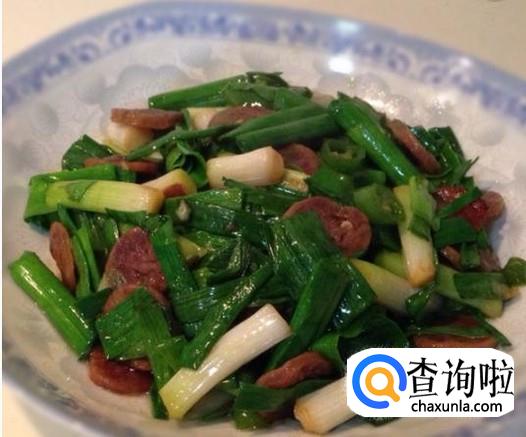 青蒜炒香肠 ,青蒜去老叶,洗净切好;香肠洗净,切片备用;锅内倒入油烧热,放入香肠炒熟,加入青蒜及盐拌匀即可。 也是一道很简单的菜,操作也简单。