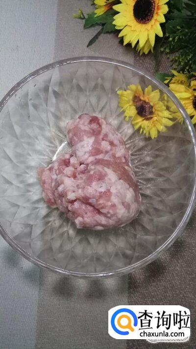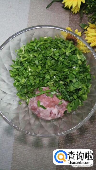 准备适量五花肉,剁成肉末,再准备适量韭菜洗净后切成碎末,和五花肉放在一起。