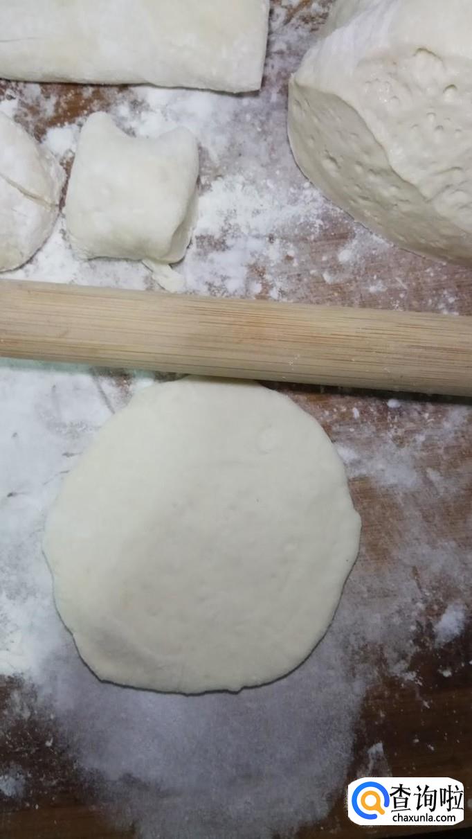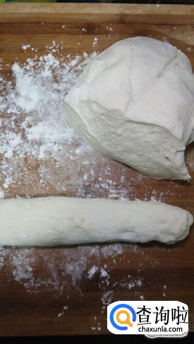 将醒发好的面团揉好,搓成长条,分成小剂子,用擀面杖擀成圆片。