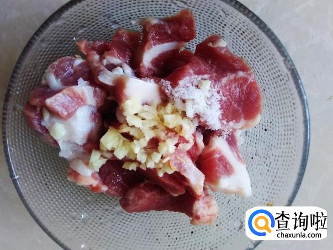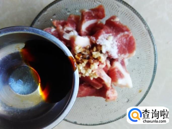 猪肉切成片,加适量的盐、姜蓉、1勺生抽、1勺料酒腌制几分钟。