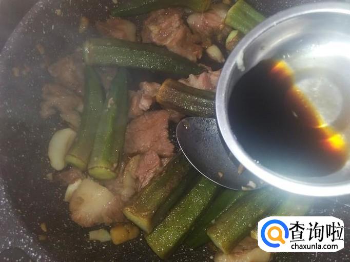 秋葵150克,猪肉200克,姜蓉、蒜米适量,2勺生抽、1勺料酒。