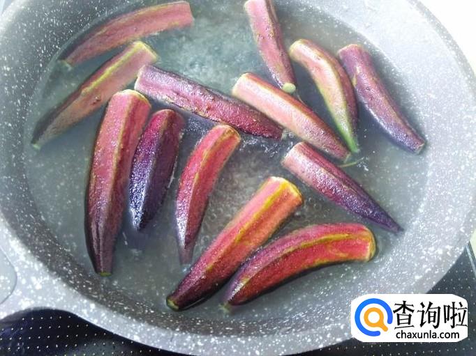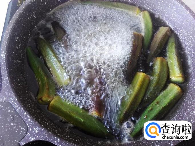 然后放秋葵进去灼1分钟左右。【秋葵灼水又变回绿色了】