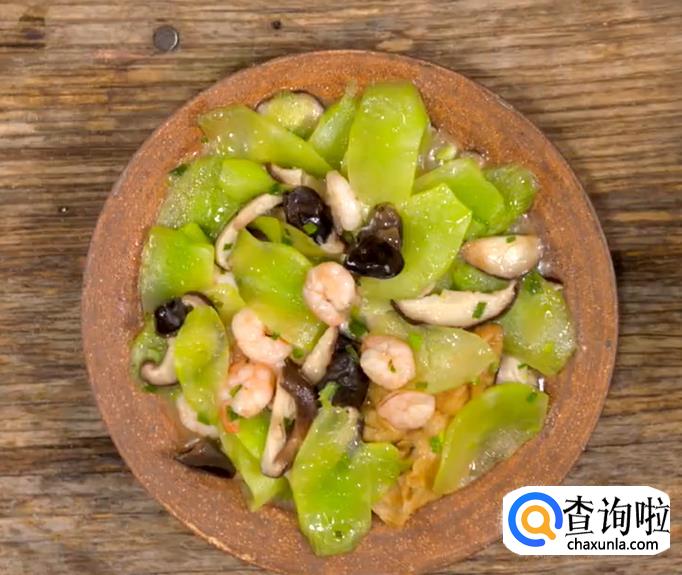 之后另起油锅,下入莴笋片和香菇,翻炒几下加入黑木耳和香菇,接着加入面筋,然后放入虾仁,最后加水淀粉勾芡,再撒入一点葱花,就可以出锅了。