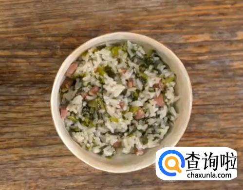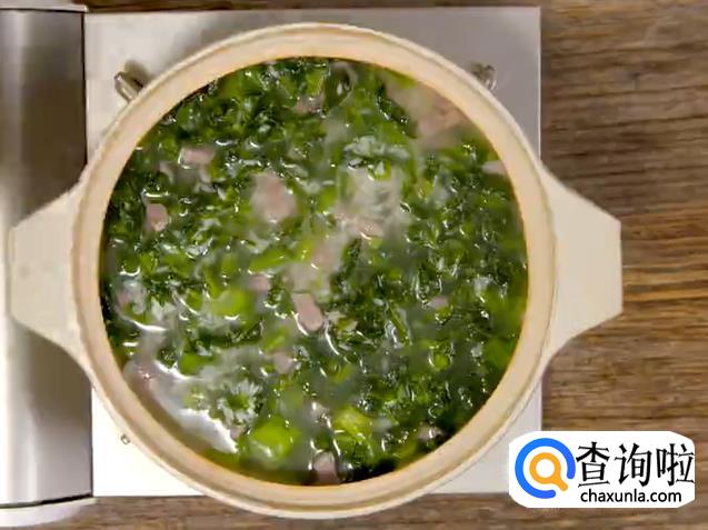 接着热锅起油,放入切碎的莴笋叶,加盐,再放入咸肉丁,适当翻炒一下出锅,将炒锅的莴笋叶和咸肉丁倒入砂锅中,再倒入纯净水,米和水的比例约为1:1.2,将菜、米、水混合均匀,开大火煮。