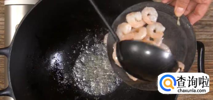 之后热锅起油,起油锅下姜片,先将虾仁翻炒变色后捞出。