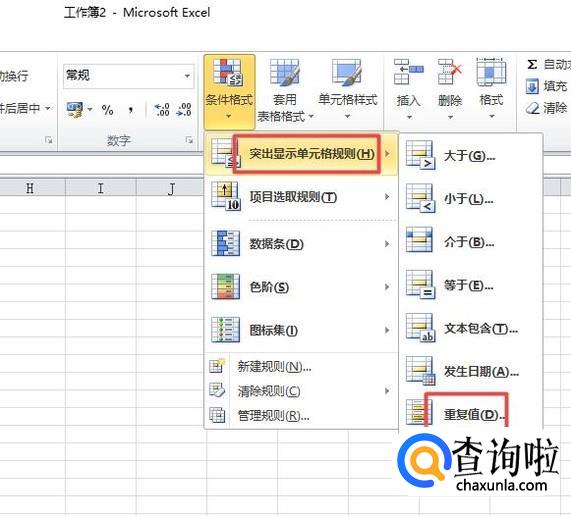 弹出的界面,我们点击突出显示单元格格式,弹出的界面,我们点击重复值;