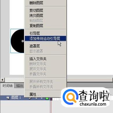 鼠标移到图层面板这里,鼠标右击,图层1;在弹出的菜单中选择:添加传统运动引导层