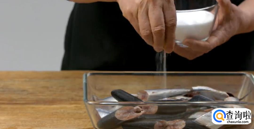 洗净后加入盐巴,清水进行腌制,蒙上保鲜膜,冷藏静置4小时。目的在于让鱼肉更加紧致。