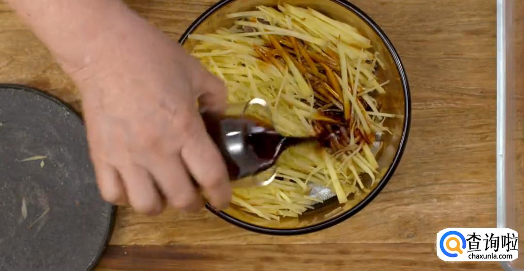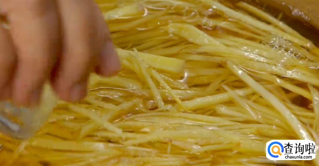 准备一块老姜,洗净切丝。将鱼肉取出放入锅中,鱼身上铺上姜丝。