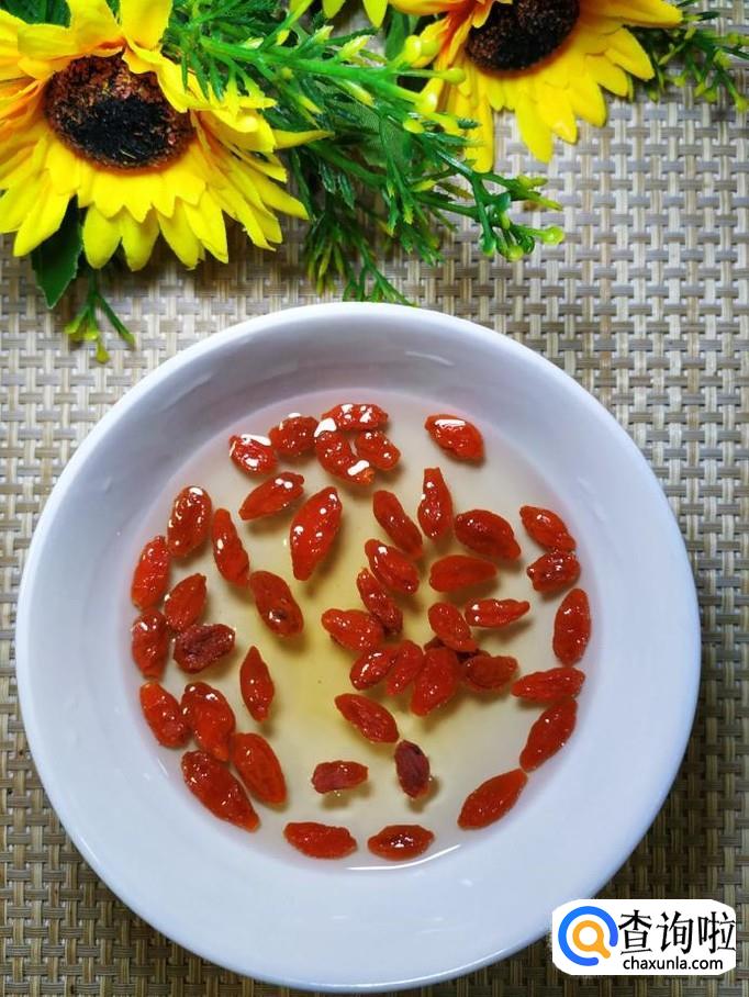 将准备好的料汁儿,倒入锅中,然后将泡好的枸杞子也倒入锅中。