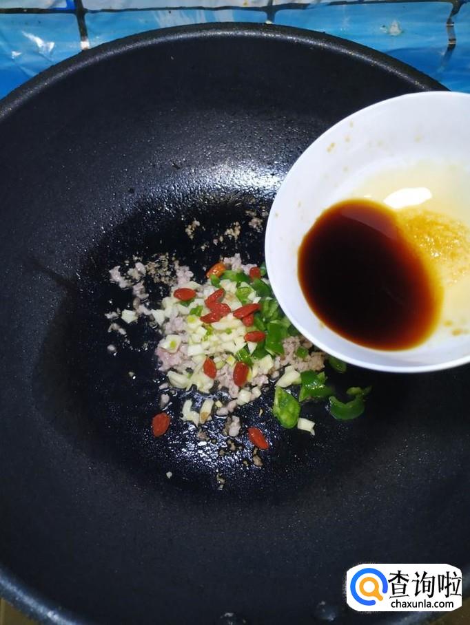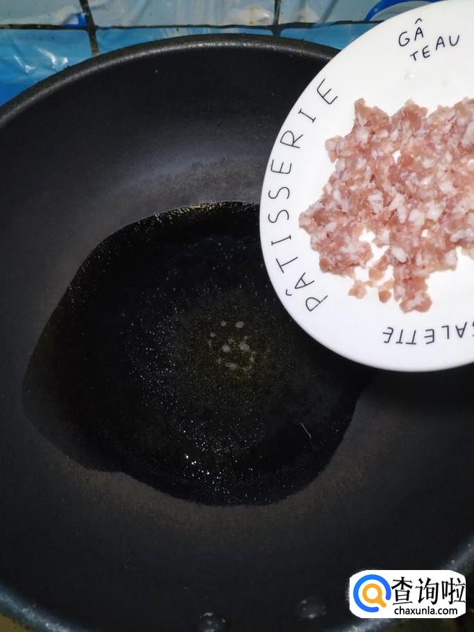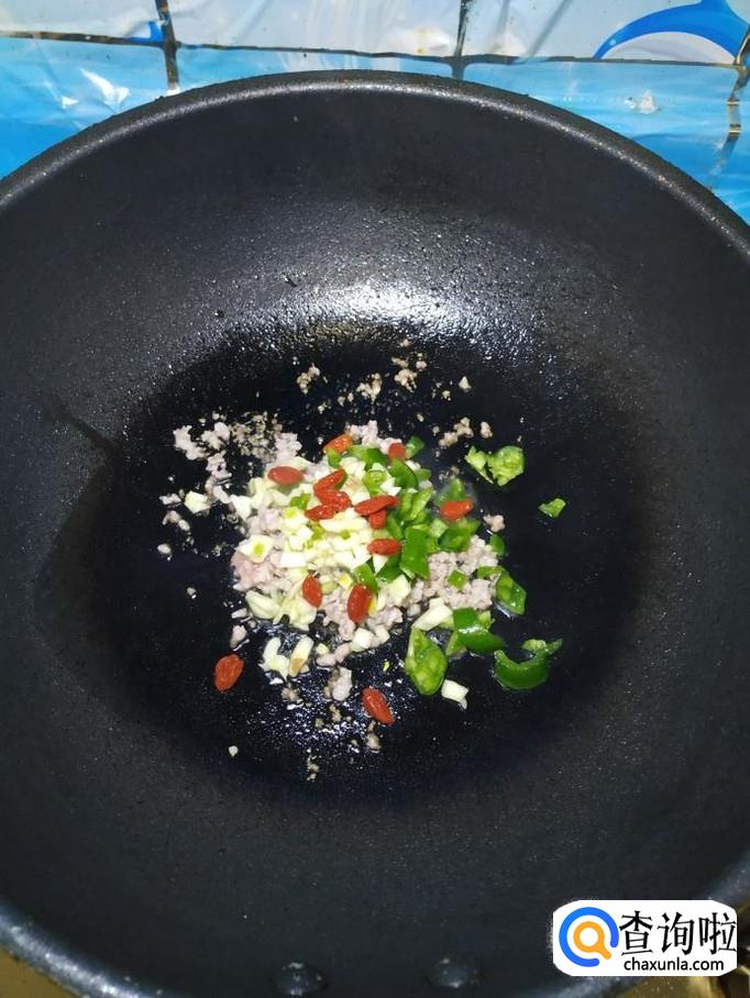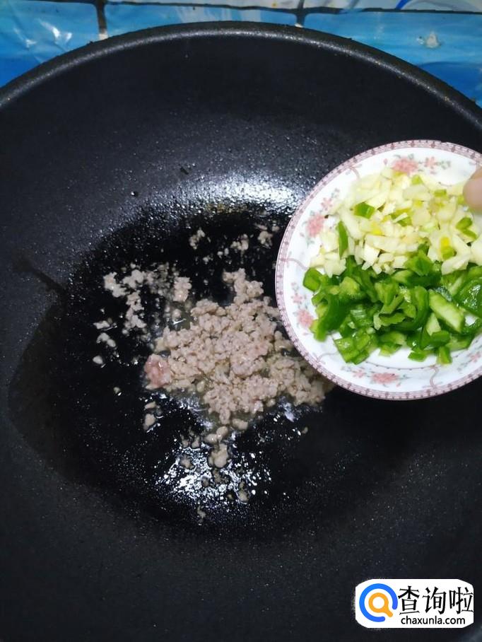 炒锅中放入适量油,油热后将猪肉末倒入锅中炒香,然后将准备好的蒜末和青椒粒倒入锅中,翻炒均匀。