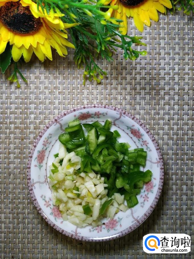 准备适量蒜和青椒,洗净后切碎,放入盘中备用,再准备适量枸杞子,用清水泡开。