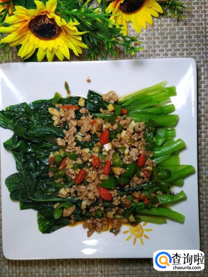 广东菜心适量,猪肉适量,枸杞子适量,青椒适量,盐适量,白糖适量,蚝油适量,料酒适量,大蒜适量。