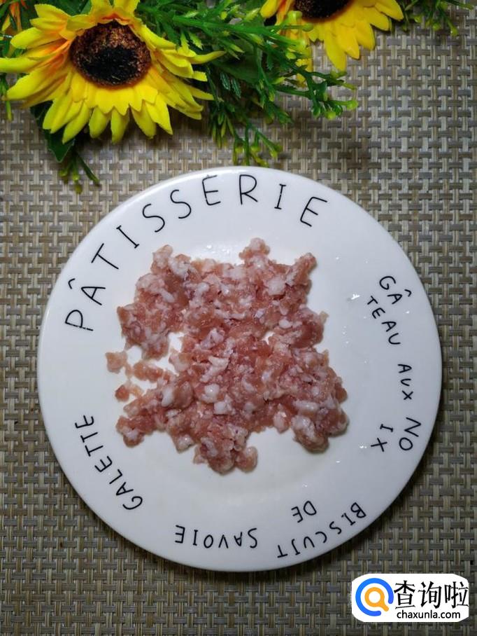 准备适量猪肉,洗净后剁成肉末,准备好料汁,这样待会就不会手忙脚乱的,碗里放入适量盐,白糖,蚝油,料酒,搅拌均匀。