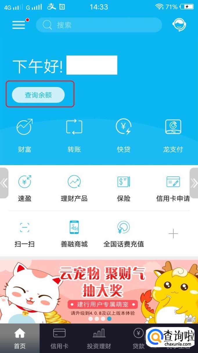 进入首页后,我们需要登录一下,如图所示,点击“查询余额”,就会进入登录界面,用建行账号(或者用身份证号、手机号)登录。