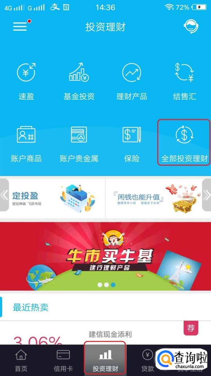 登录后,我们点击下方的“投资理财”按钮,进入理财页面,其中有一个“全部投资理财”图标,点击一下。