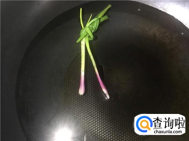 香葱清洗干净,打成葱节,然后放入锅中,加入适量的清水,大火煮开。
