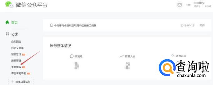 登录微信公众号之后,在首页面中找到“页面模板”选项。