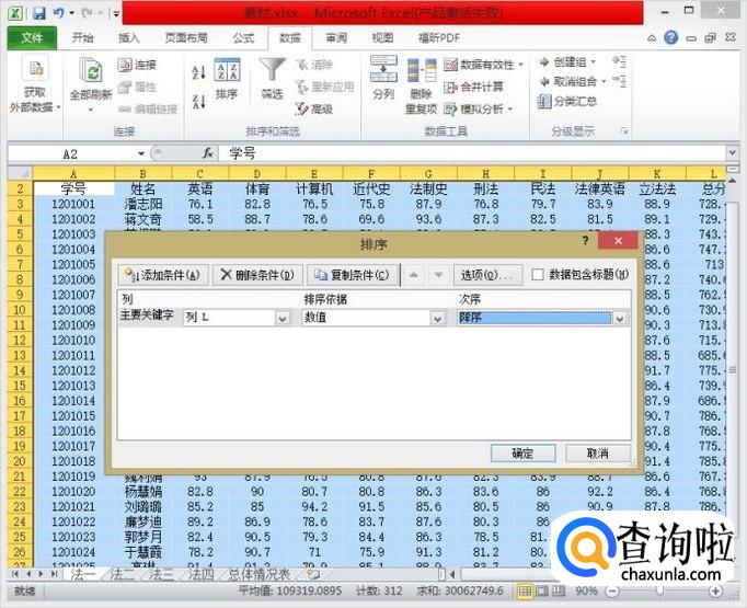单击“确定”,数据已经以总分降序排序,如下图