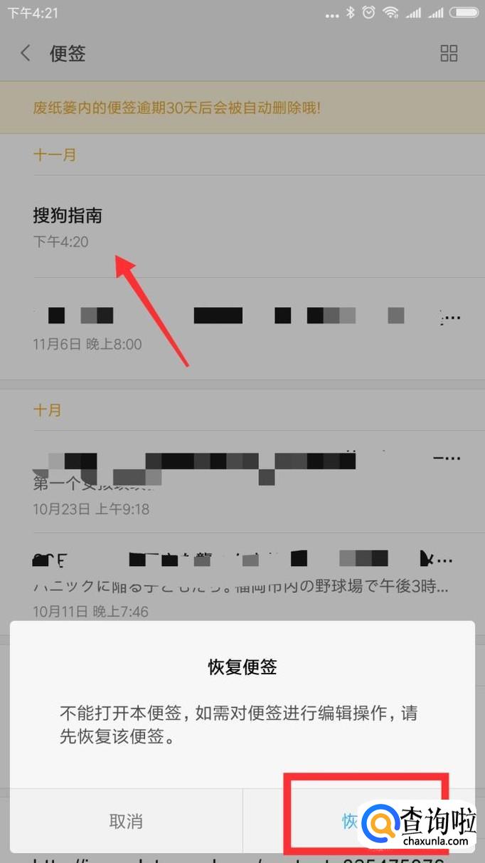 找到你想要恢复的那一条便签,在下图中就可以看见小编提前删掉的酷知网这一条记录了,然后点击记录,就会出现如图中的界面,点击恢复按钮。