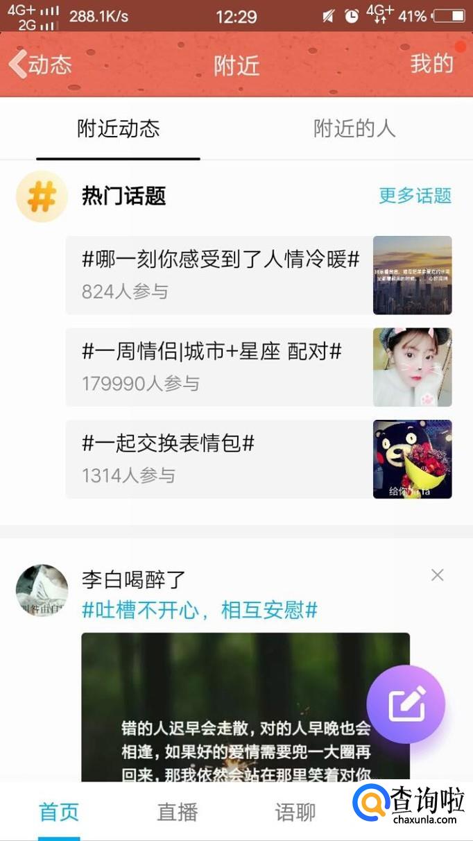 然后我们在相关页面点击右下角的动态,再点击附近。