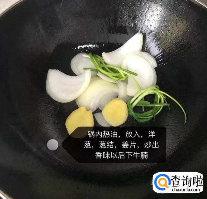 接着过中饭豆适量的食用油,待油冒烟,放入葱结、洋葱和生姜,煸炒出香味,下牛肉,如下图所示。