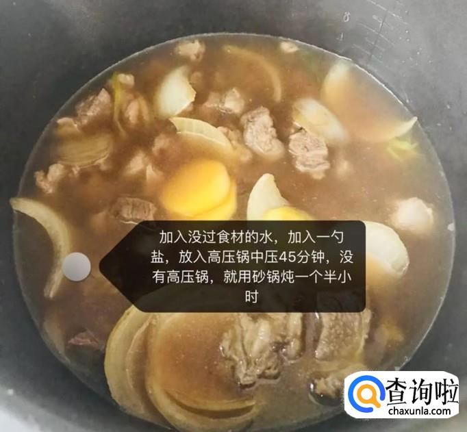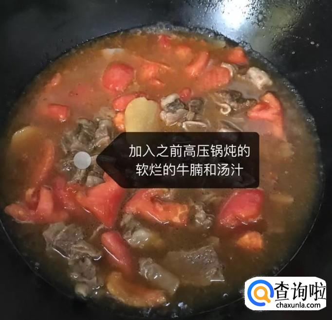 然后加入高压锅炖好的牛腩和所有的汤汁,如下图所示。