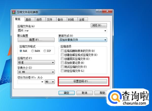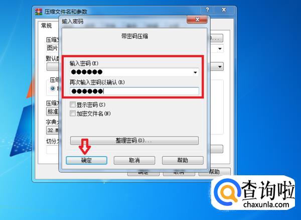 然后再出现的界面中进行密码的设置,设置完后,点击确定返回压缩设置界面,点击“常规”页面中的“确定”按钮。