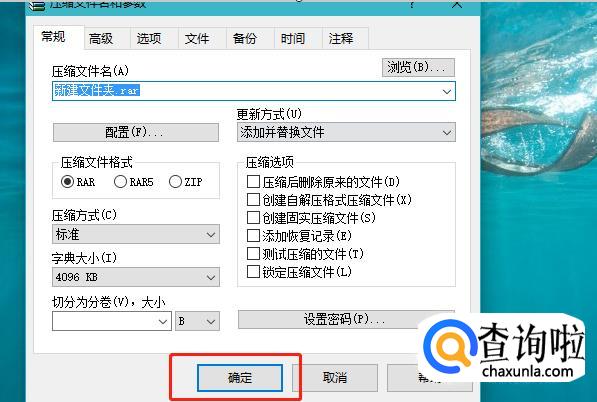 在弹出的压缩文件设置框里,直接点击下面的确定则可。