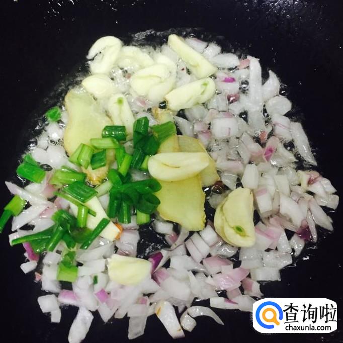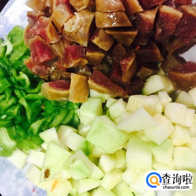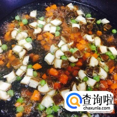 葱姜蒜适量切片,豌豆、胡萝卜、洋葱、香菇、西葫芦、青椒切小粒,总之冰箱粒有什么放什么很随意的,香肠一根煮十分钟也切小粒