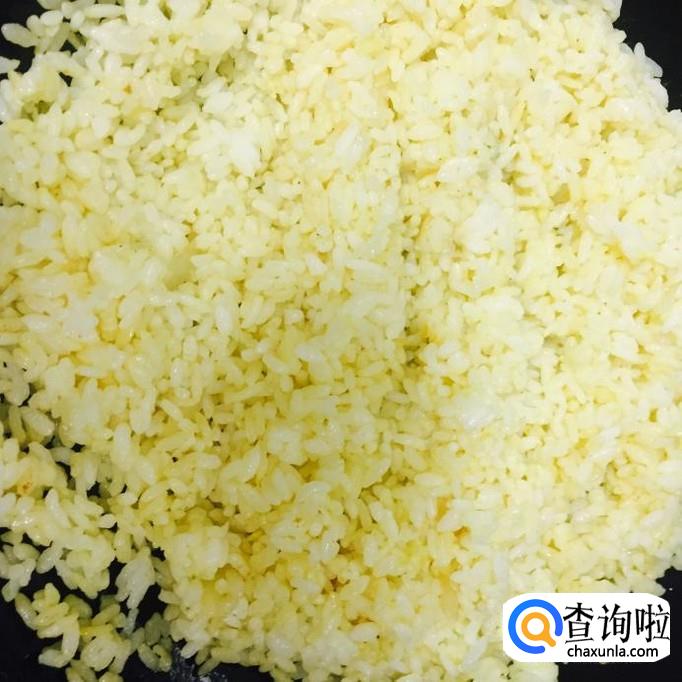 另起油锅烧热,把准备好的蛋黄米饭放入锅中不断翻炒,这步要有耐心,慢慢炒到米饭松散粒粒分明,像图中这样的状态