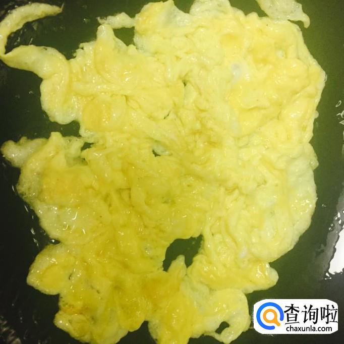 两个鸡蛋磕入碗中放一点胡椒粉,胡椒粉可以让去腥增香,锅中油烧热,鸡蛋搅打出大泡再入锅快速炒散盛出,这样炒出来的鸡蛋才会嫩滑