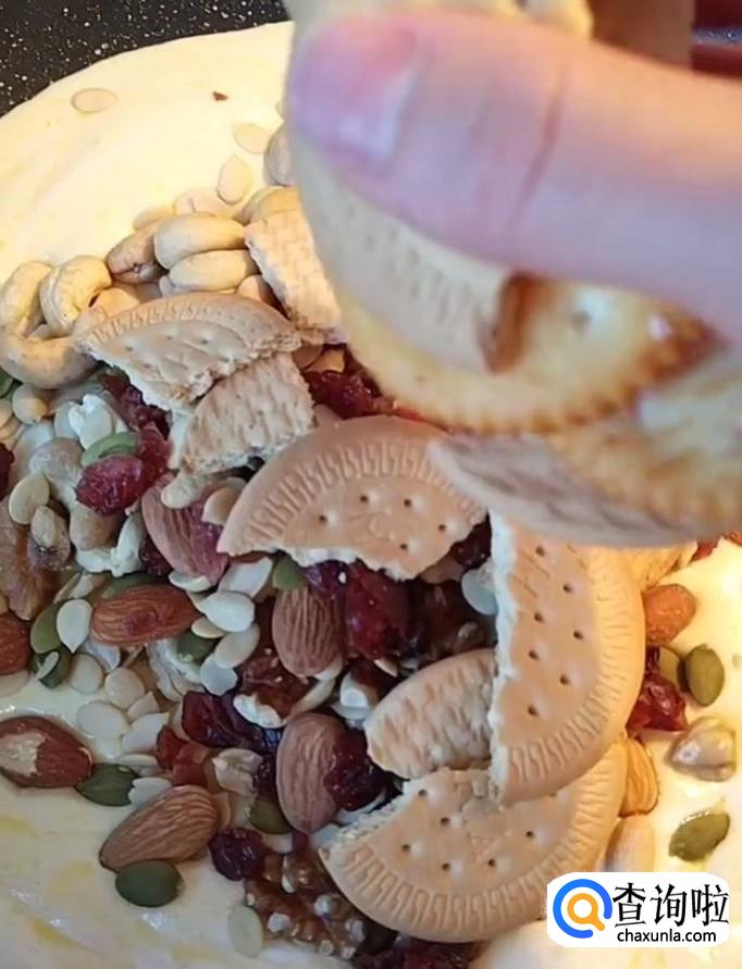 然后我们倒入适量的自己爱吃的坚果,撒上一些饼干碎,翻拌均匀