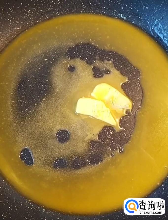 首先,我们在平底锅中放入40g黄油,小火加热至完全融化