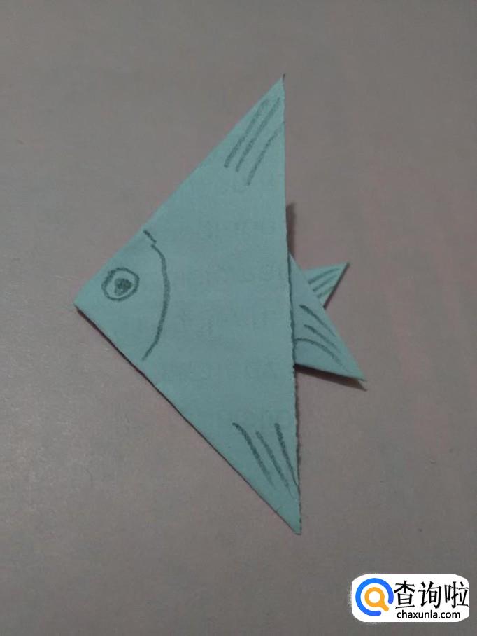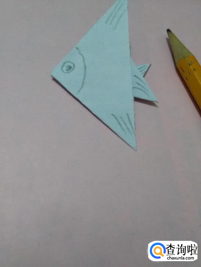 用笔在左边的角处画一条弧线,分出头部,在头部上面画一只眼睛,再用笔从右侧的四个角处画几条短线,表示鱼鳍,小燕鱼就折好了。