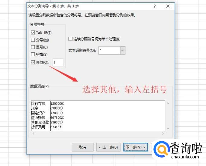 接下来需要选择分隔符号的类型了,我们选择其他,在输入框中输入左括号,如下图所示