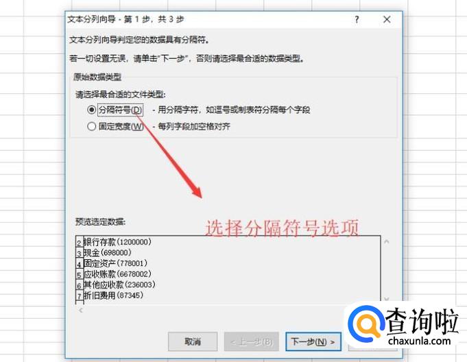 在弹出的文本分列向导中我们点击分隔符号选项,接着点击下一步按钮,如下图所示