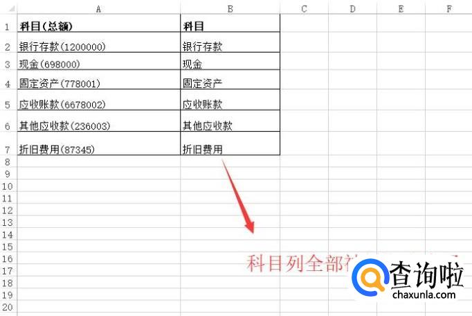 最后设置完毕,我们就可以在B列看到所有的科目内容都内提取出来了,如下图所示