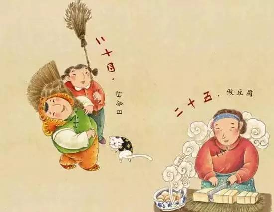 二十三,祭灶官,二十四,扫房子,二十五,磨豆腐,二十六,去割肉,二十七,杀只鸡,二十八,蒸枣花,二十九,去打酒,大年三十儿捏饺儿,初一撅着屁股乱作揖儿!