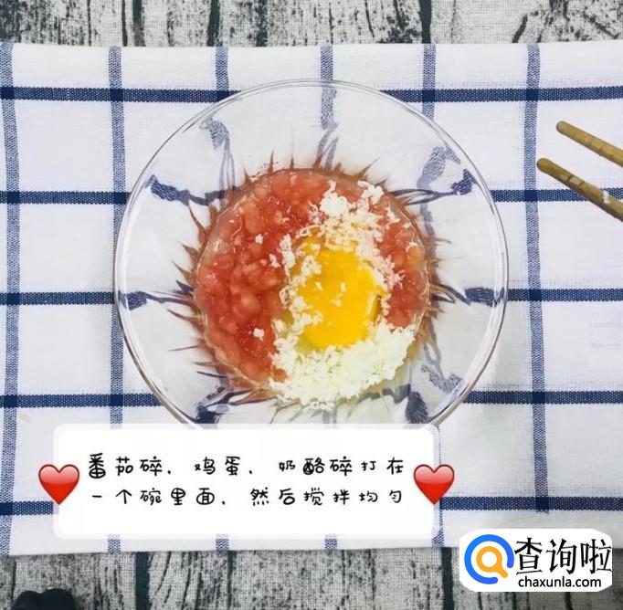 接着将番茄碎、鸡蛋和奶酪碎一同打入一个碗中,用筷子搅拌均匀,如下图所示。小贴士:搅拌到奶酪碎完全融化了就可以了。