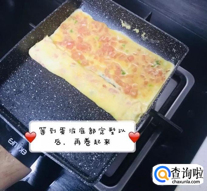 接着等到这半蛋液定型之后,再卷起来,如下图所示。
